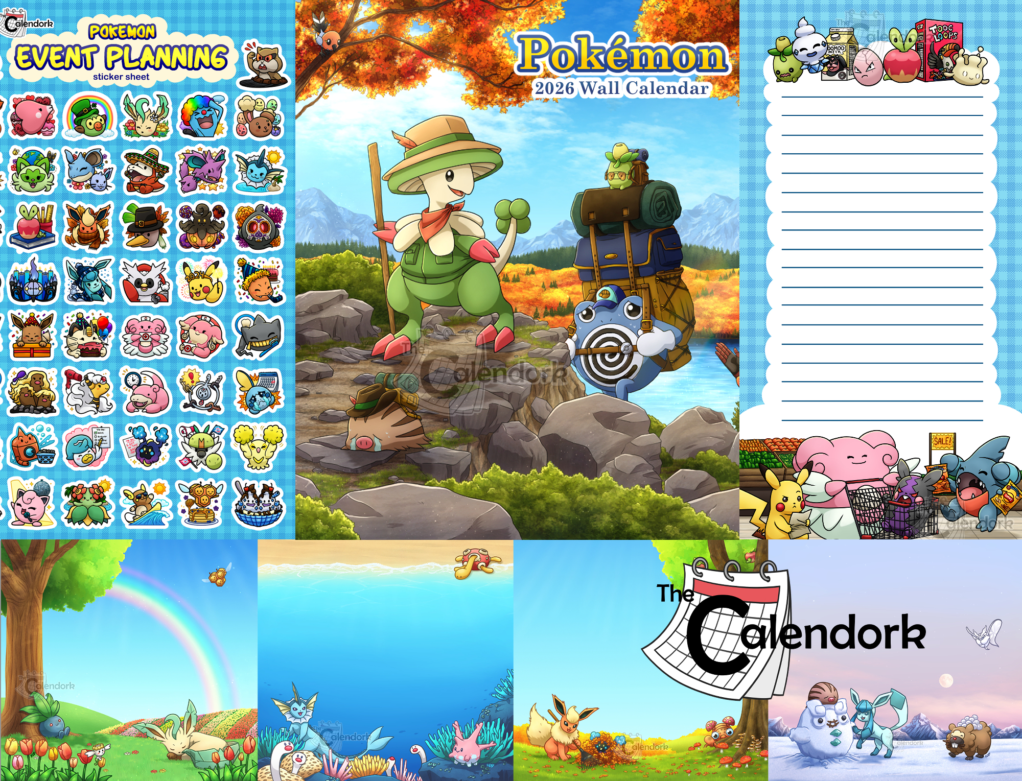 Plan your year with this ultimate Poke Planning Pack! Includes one wall calendar, 1 stickers sheet with 50 different planning stickers, 4 pads of 50 Post It Notes and 1 grocery themed notepad. All featuring hand drawn, digitally coloured artwork of different Pokémon from across all nine generations.