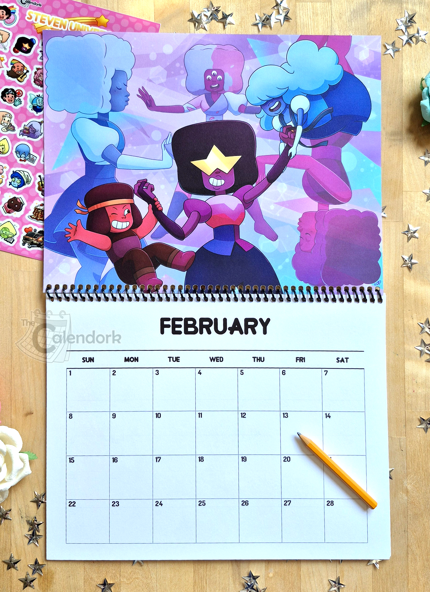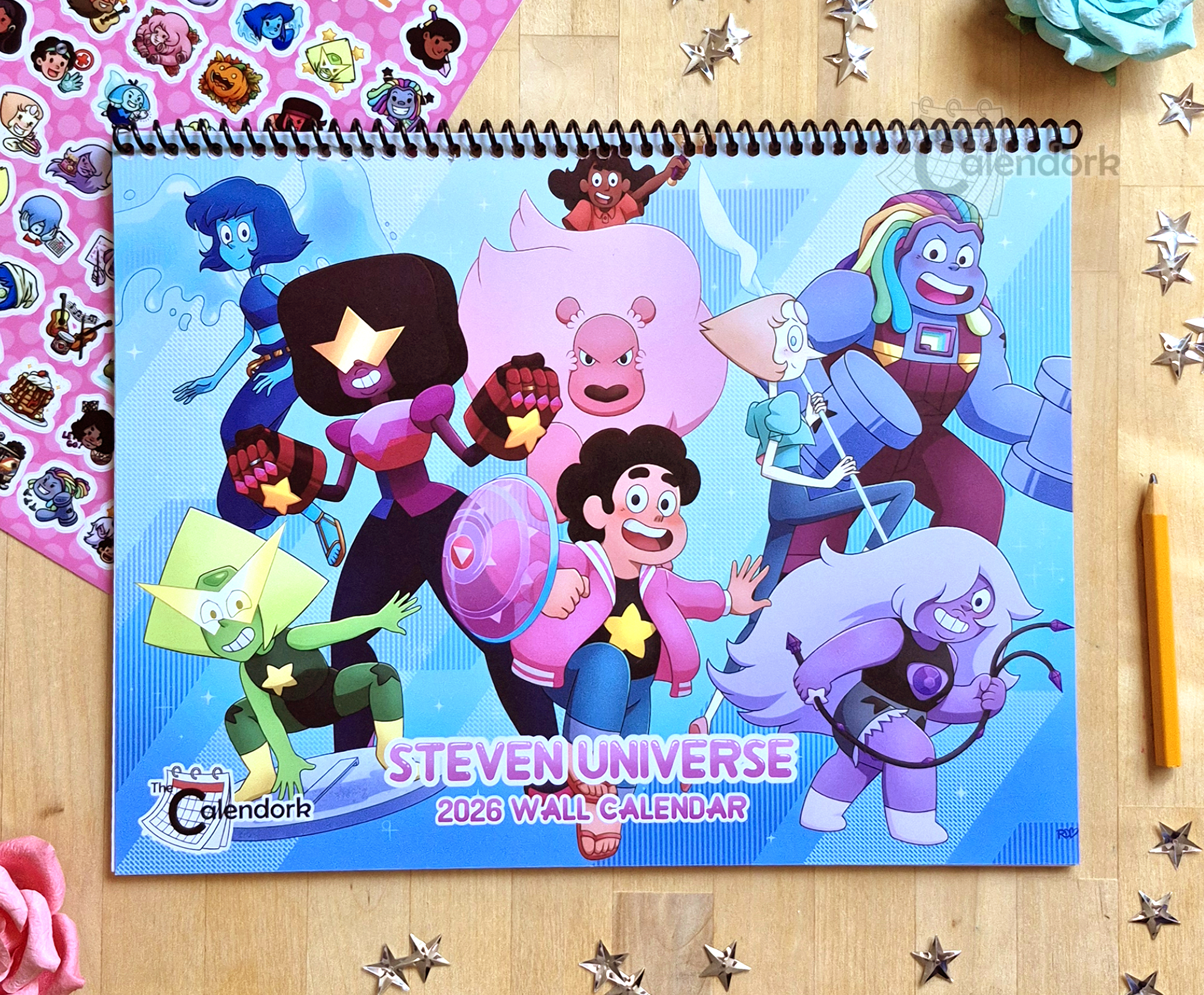 This wall calendar features 12 original illustrations of Steven and the gang in a variety of settings. Set after the events of Steven Universe Future this calendar imagines what sorts of things our favorite gems might be getting up to in Beach City, Little Homeworld and beyond. Drawn by hand and digitally colored this calendar is a year long artistic celebration of all things Steven Universe!